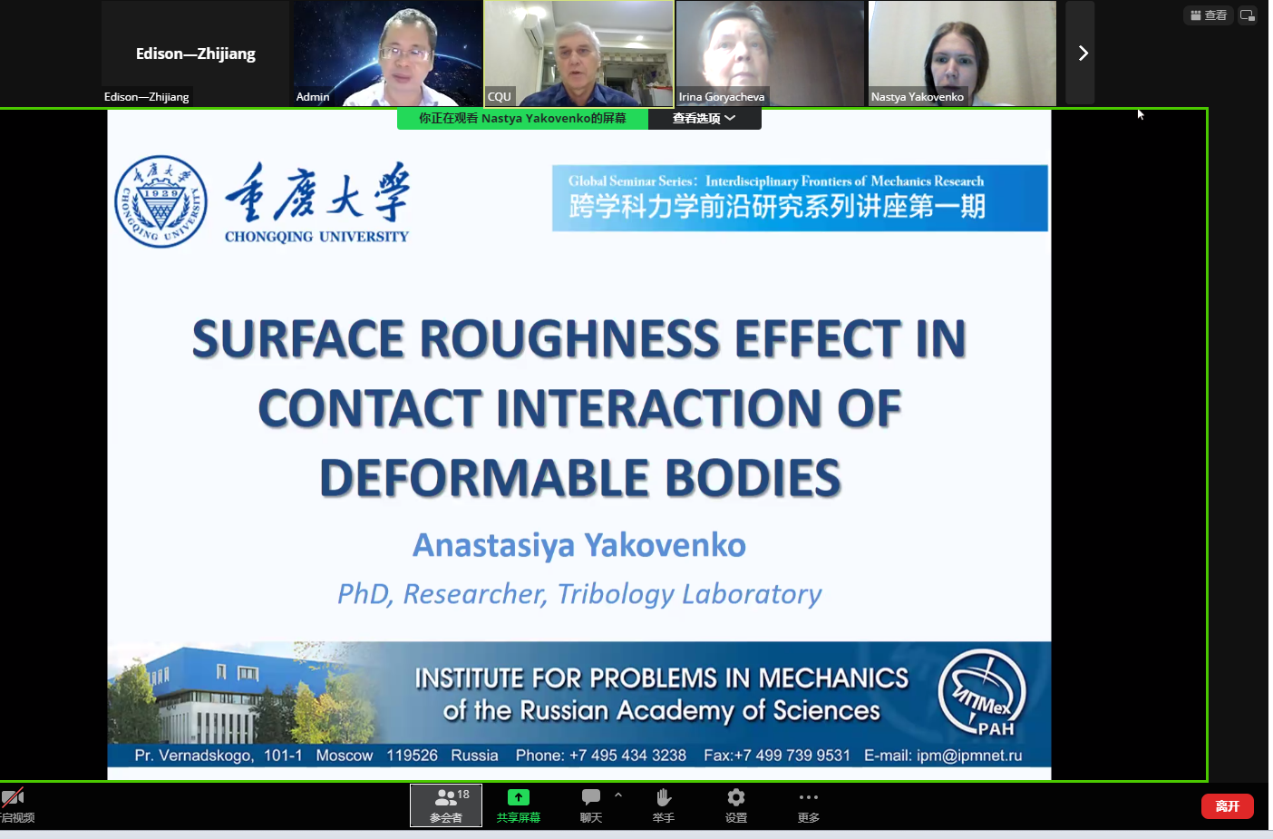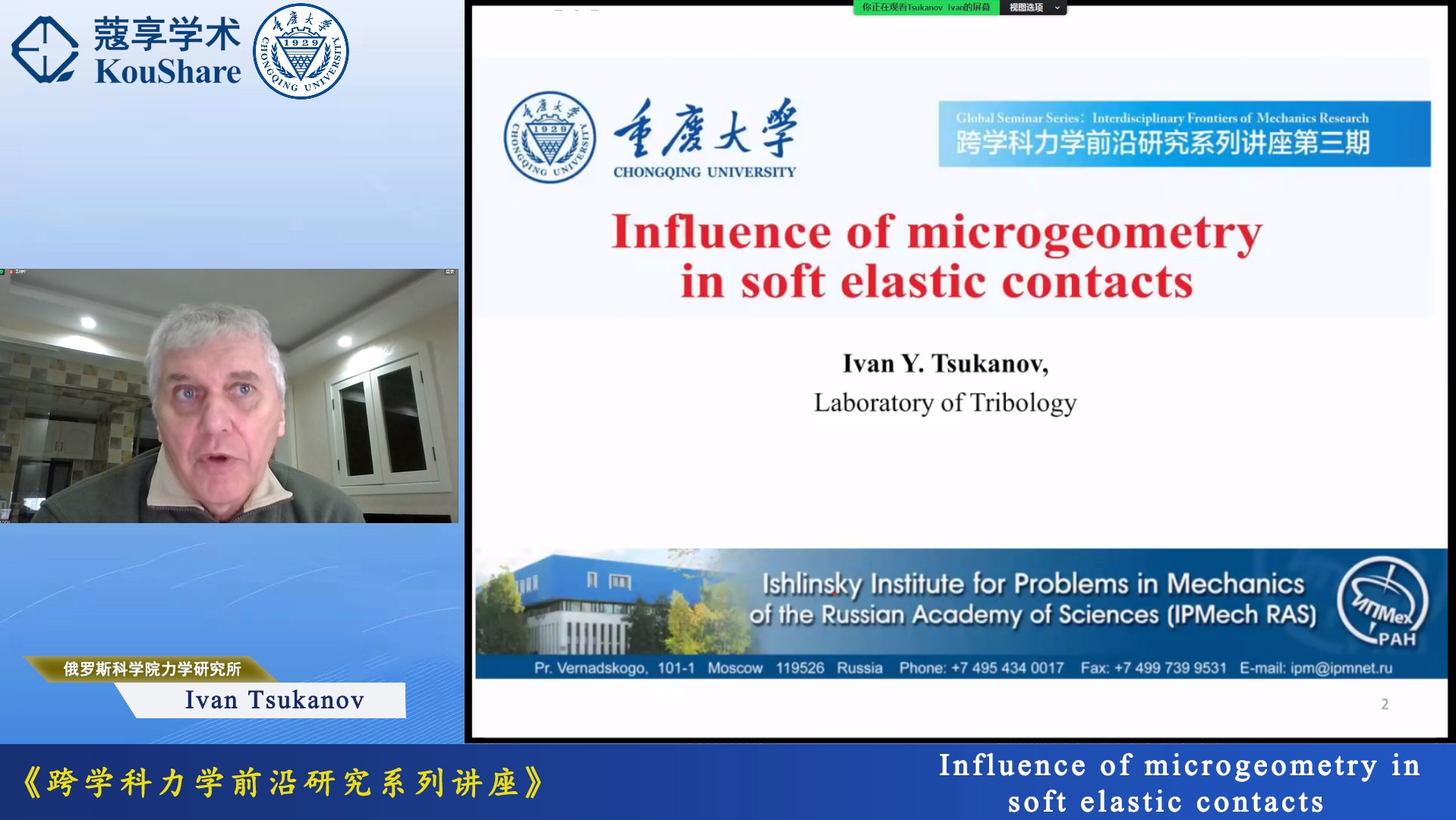 2023年11月13日19:00,丝袜色情片 “跨学科力学前沿研究”全球系列讲座第3期在线召开。讲座邀请Ivan Tsukanov研究员开展了主题为“Influence of Microgeometry in Soft Elastic Contacts”的学术讲座。 学院Feodor M. Borodich教授介绍了本次讲座的安排及嘉宾背景。Ivan Tsukanov是俄罗斯科学院力学研究所摩擦学实验室的高级研究员,也是俄罗斯摩擦学委员会的成员。博士就读于莫斯科理工大学(机械工程博士学位)...