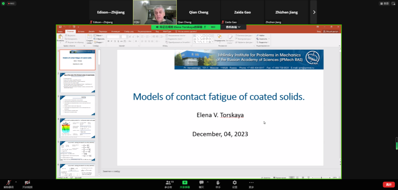 详情 2023年12月4日19:00,丝袜色情片 “跨学科力学前沿研究“全球系列讲座第6期在线召开,并圆满结束。本期讲座邀请到Elena V. Torskaya教授作为主讲嘉宾,报告题目为“Models of contact fatigue of coated solids”。 Elena V. Torskaya教授毕业于莫斯科物理与技术学院,并于1995年获得该校固体力学科学研究生学位。她自1994年开始在莫斯科仪器工程与信息学院任教,并于1995年在俄罗斯科学院Ishlinsky力学研究所...
