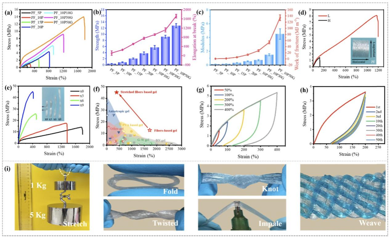 同时,可以通过改变PVA比例、浸渍溶液、预拉伸比例和宽度来优化PVA水凝胶的力学性能(图3)。有意思的是,虽然单独加入PVA或甘油均可以提升其强度,但同时引入PVA和甘油,水凝胶断裂强度提升最大,即PVA-甘油对水凝胶力学性能的影响比单一的PVA或者甘油大。此外,水凝胶在拉伸、折叠、扭曲、打结、穿刺和编织下表现出了高强度和柔性。利用宽度为8mm、厚度为0.8mm的水凝胶轻松承受6kg的重量(超过水凝胶的10000倍)。制备的各向异性纤维基水凝胶还可以在不破裂的情况下编织成复杂的图案和结构,减少了其在不同应用中的局限性。
