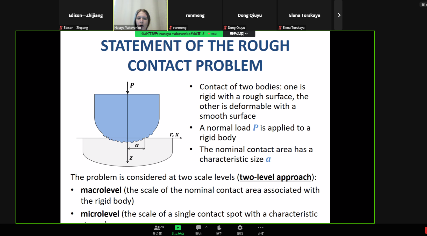 学院Feodor M. Borodich教授介绍了本次讲座的安排及嘉宾背景。Anastasiya Yakovenko博士是Ishlinsky力学研究所摩擦学实验室的研究员,考虑物体表面几何形状的物体接触分析建模领域的专家。本硕博均就读于莫斯科物理技术学院。2022年,她成功完成了主题为可变形固体力学博士论文的答辩。现共发表了15篇科学期刊,同时获得了RAS学生奖章。