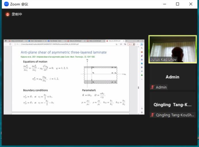 “力学交叉融合”全球前沿学科系列讲座第10期和第11期分别在线召开。讲座先后邀请欧洲科学院院士Julius Kaplunov教授开展了主题为“Multiparametric Analysis of High Contrast Elastic Laminates”的学术讲座、俄罗斯科学院地球物理学Schmidt研究所首席研究科学家(IPE RAS)Alexander N. Galybin教授开展了主题为“Inverse and semi-inverse problems for fracture detection in layered media”的学术讲座。