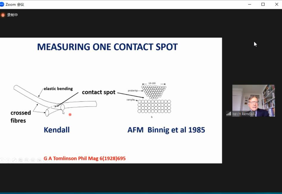 首先,俄罗斯科学院外籍院士Fedor Borodich教授介绍了本次讲座的安排及嘉宾背景。Kendall院士是英国皇家学会院士(FRS),与K. L. Johnson、A. D. Roberts共同提出了著名的JKR粘附接触理论。据谷歌学术统计,JRK模型的原始论文(单篇)迄今已经被引用9300多次。