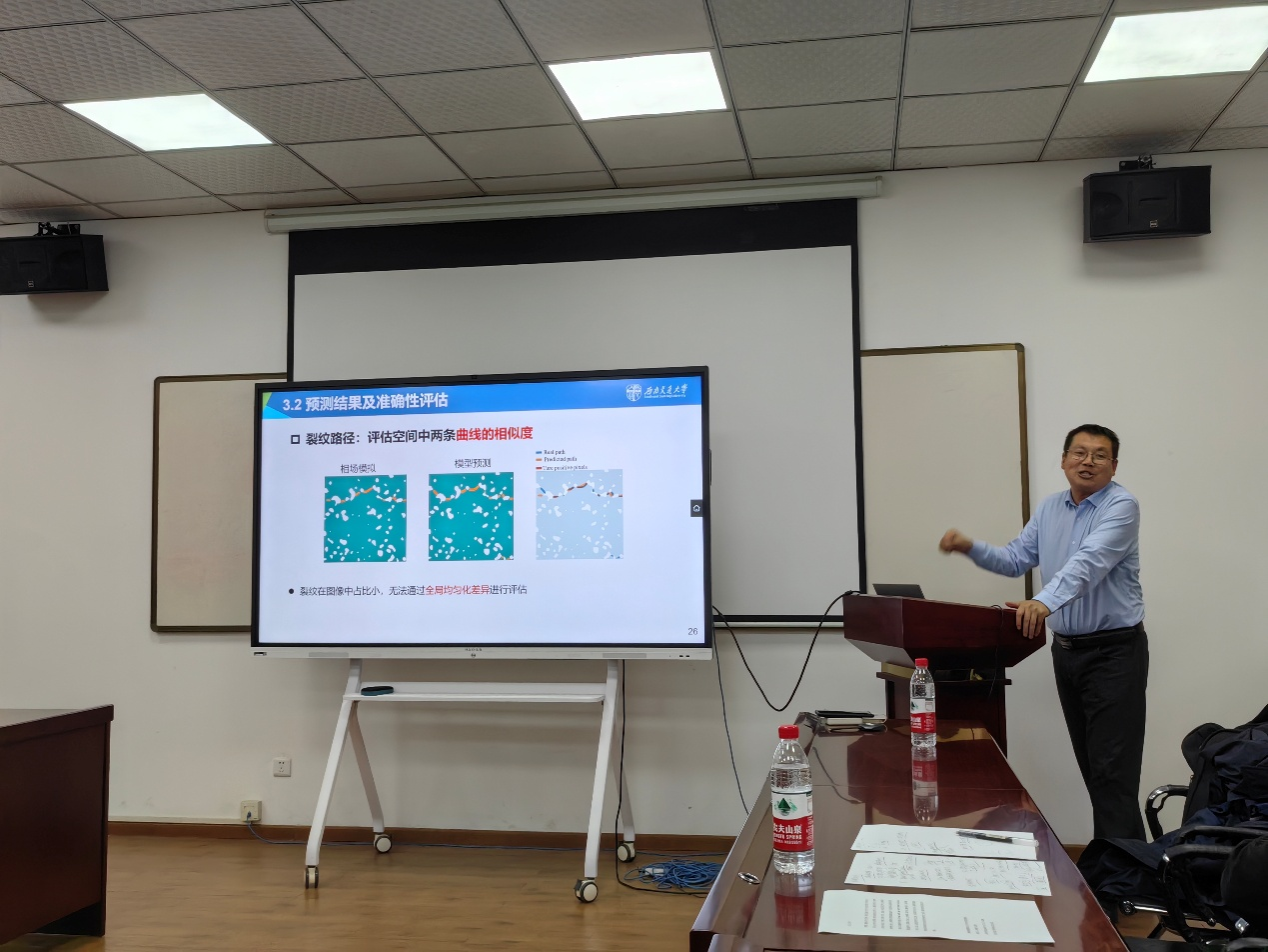 ,并于理科楼205会议室进行学术交流,作了题为“随机多孔介质中不连续裂纹路径的精准预测”的主题报告。学院教师代表及工程学部师生30余人出席听讲。