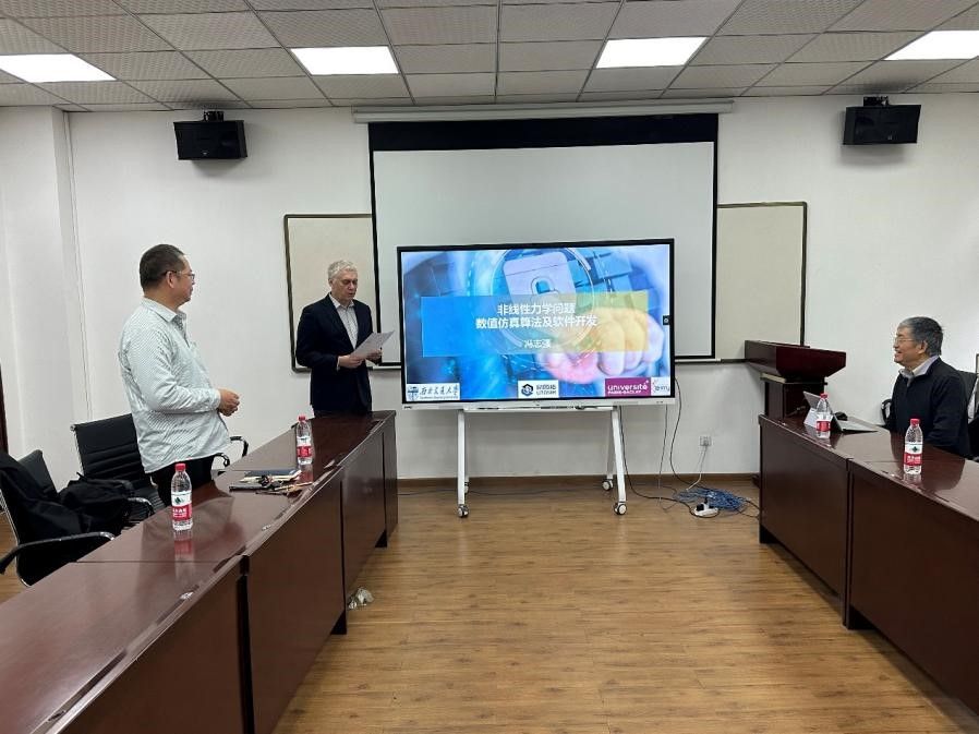 Borodich教授首先对两位专家作了介绍,并对他们的到来表示热烈欢迎。Andrey Pepelyshev博士现为英国卡迪夫大学数学学院高级讲师,研究领域涵盖实验优化设计、时间序列分析和应用统计学,迄今已发表60多篇高水平国际期刊论文。冯志强教授现为西南交通大学特聘教授、国家级特聘专家,同时担任重庆励颐拓软件有限公司董事长、中瑞(重庆两江)产业园转化研究院院长,并兼任巴黎-萨克雷(Paris-Saclay)大学特级终身教授。2017年他荣获法国政府教学与科研骑土勋章。