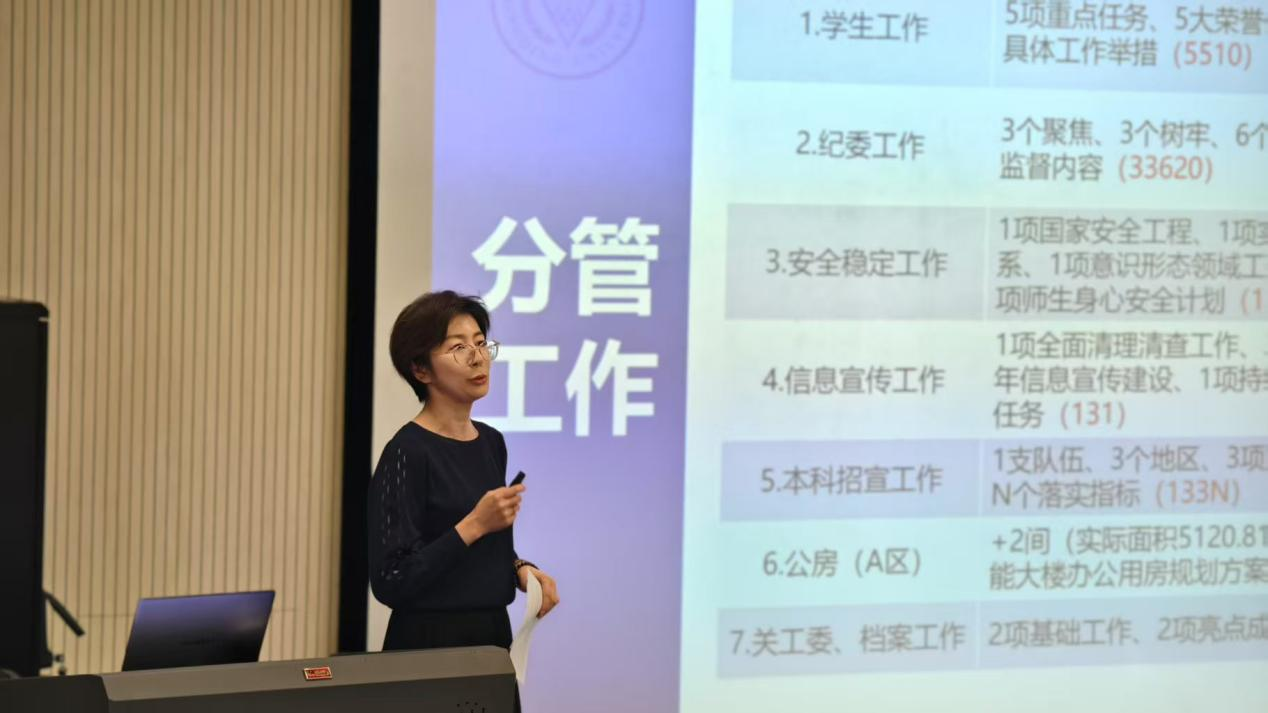 程乐副书记综合介绍了分管的学生工作、纪委工作、安全稳定工作,以及信息、招生、公房、关工委和档案工作相关情况,并重点围绕就业、学风、育人、安全等角度汇报了学生工作相关举措。