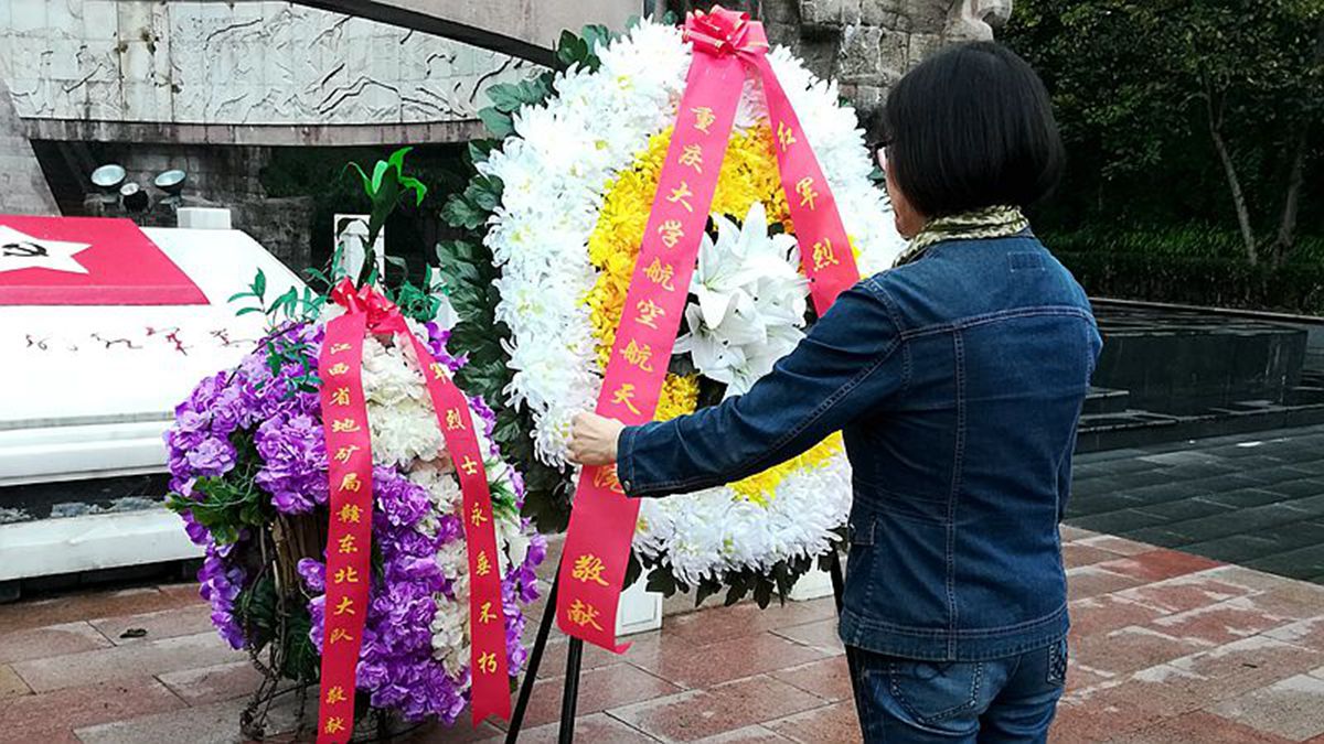 参观完会址,大家又沿着充满红色元素的红军街前往红军山烈士陵园缅怀革命先辈,并沿途参观了红军总政治部旧址。路边老人们的红歌表演更是拉近了大家与那些枪林弹雨年代的距离。经过317级大阶梯的攀爬,大家终于到达红军山烈士陵园。万玲书记带领全体党员向烈士敬献了花圈,并仔细整理挽联,随后,全体党员向烈士墓三鞠躬,致以深深的敬意。最后,万玲书记带领全体党员在烈士纪念碑前重温了入党誓词。