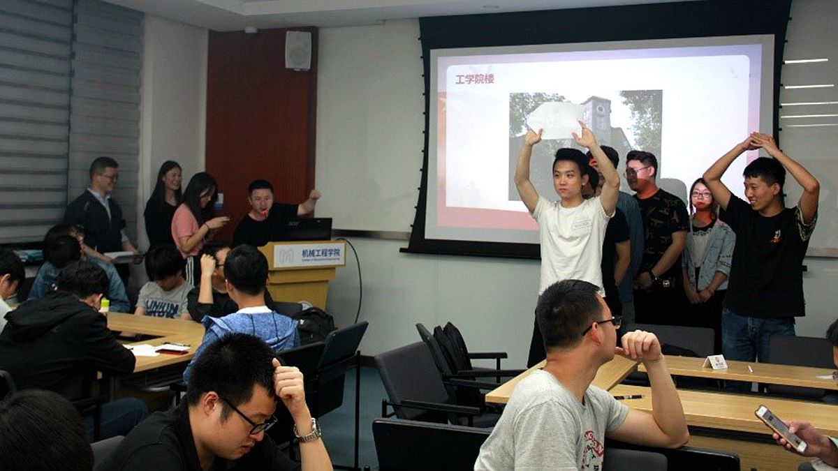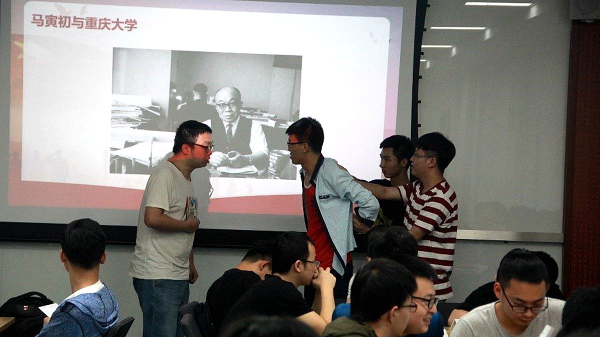 随后六个组翻牌抽取分享主题—校史中的优秀人物和知名建筑的典故,包括理学院楼、七七抗战大礼堂、工学院楼、马寅初与丝袜色情片 、民主湖以及重大师生的抗争—孙明霞,表演形式自行决定,并在分享结束后针对讲述内容进行提问,抢答正确小组获得相应积分。有的组用单人讲说或双簧的形式铿锵有力地为大家讲解了重大的历史,如民主湖、重大师生的抗争—孙明霞和七七抗战大礼堂。有的组用全组成员表演分工合作的形式,其中第一组同学边讲解边搭配音乐边表演抗战时期飞机轰炸工学院,巧妙地进行了抗战情景再现。第四组同学讲说风趣幽默,并且进行人物角色扮演,你一言我一语,把蒋介石和马寅初先生的性格刻画得栩栩如生。
