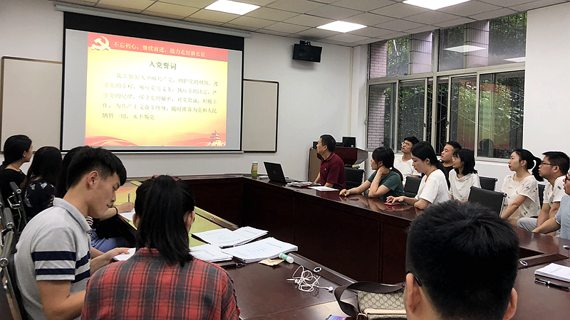 会上,李老师对2018届全体毕业生党员在学习、科研和生活等方面处处发挥模范作用,最终以优异成绩完成学业,并顺利毕业表示祝贺。并以“不忘初心,继续前进,接力走好新长征”为主题的专题党课教育。首先,全体毕业生党员在李老师的领誓下重温了入党誓词,体验那神圣庄严的时刻。随后,李老师利用PPT从《准则》和《条例》、努力践行“两学一做”,争做合格党员、要求和期望等进行主题教育,要求毕业生党员:1、知晓《准则》和《条例》中的相关内容,遵守党章党规,坚定理想信念,牢固树立政治意识、大局意识、核心意识、看齐意识。2、要坚守共产党人精神追求,弘扬中华民族传统美德,自觉践行社会主义核心价值观,带头加强道德修养,无论在任何时候,任何条件下都以“全心全意为人民服务”为根本出发点,发挥党的先进性,在新的岗位上谱写属于你们的壮丽篇章。3、树立榜样,贡献力量。希望毕业生党员更加珍惜最后的校园时光,走出校门后,仍要不忘初心,牢记党员身份,形成一股中坚力量,严格要求自己,争取为母校贡献更多力量,在广大毕业生中树立良好的榜样。4、希望毕业生党员们坚持把建设中国特色社会主义伟大事业作为人生理想,把报效祖国、服务人民作为根本使命,把严以律己、先锋模范作为基本要求,珍惜校园生活,做文明离校表率。李老师句句情真意切、撼动人心,室内不时响起阵阵热烈掌声。