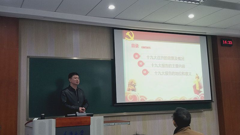 贲老师以《开启新时代,迈向新目标——党的十九大精神解读》为题,从十九大召开的背景及概况、十九大报告的主要内容、十九大报告的地位和意义三个方面对党的十九大进行了生动的讲解和解读。他首先分析介绍了十九大召开前的国际和国内环境,贲老师表示,世界正处于大发展大变革大调整时期,在此情况下,不稳定性不确定性凸显;就国内而言,我国正处于全面建成小康社会和各方面制度更加成熟、更加定型的关键期,也是中国共产党第一个百年梦想和第二个百年梦想的交汇期。在此背景下召开的十九大是我国发展关键时期的一次十分重要的大会,具有更加深远的意义,这也是十九大受到国内外空前关注的重要原因。随后,贲老师介绍了十九大的五项主要议程及大会主题,十九大会议主题是“不忘初心,牢记使命,高举中国特色社会主义伟大旗帜,决胜全面建成小康社会,夺取新时代中国特色社会主义伟大胜利,为实现中华民族伟大复兴的中国梦不懈奋斗”,这个主题明确回答了党在新时代举什么旗、走什么路、以什么样精神状态、担负什么样的历史使命、实现什么样的奋斗目标的重大问题。贲老师结合十九大报告梳理了我国在过去5年取得的成绩及存在的问题,并阐释了新时代的主要矛盾、新战略、新思想。最后,贲老师为大家详细分析了十九大精神在政治、历史、理论、实践等方面的意义。
