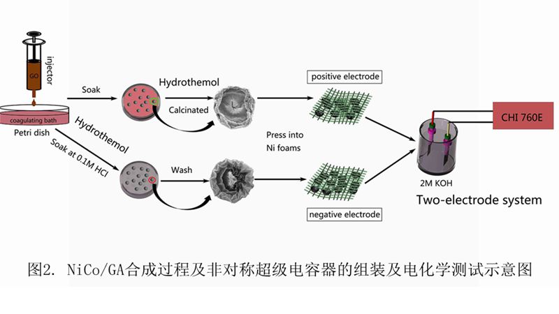 该方法具有一定的普适性,通过使用不同种类的凝固浴,例如酸性溶液(HCl)、碱性溶液(NaOH)、中性盐溶液(NaCl)等,均可制备得水凝胶,同时借助一定浓度的过渡金属盐溶液(Co(NO3)2Ni(NO3)2等),并经过一定的后处理,可实现金属氧化物与石墨烯的三维复合气凝胶。该类气凝胶在储能、催化、传感器领域具有极大的应用潜力。例如在该工作中,成功合成镍钴双氧化物/石墨烯气凝胶,简称:NiCo/GA,并组装成超级电容器深入研究其赝电容性能。基于NiCo/GApure GA的非对称超级电容器,具有优异的性能,在功率密度为804.54500 W/kg的条件下,能量密度可达到24.621 Wh/kg,在经过5000次循环测试后,性能不减反而有20%的提升。该研究工作具体内容发表在ACS Applied Materials & Interfaces (ACS AMI, IF=7.504),题为“Fabricating 3D macroscopic graphene-based architectures with outstanding flexibility by novel liquid drop/colloid flocculation approach for energy storage applications”。论文第一作者为丝袜色情片 硕士研究生韩蒙同学,通讯作者为丝袜色情片 徐朝和研究员、胡宁教授以及新加坡南洋理工大学Lee Jong-Min教授。