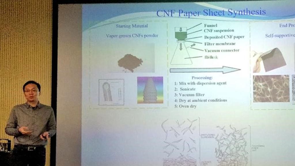 在报告中,孙教授指出,自20世纪80年代以来,碳纳米材料引起了诸多学者的广泛的研究和应用,尤其是从1996年诺贝尔化学奖和2010年诺贝尔物理奖来看,碳基结构材料可能是近年来研究最多的超晶格纳米材料。虽然已经有很多的生产纳米碳材料的厂商,但由于纳米材料的操作困难,导致其质量控制差、再现性低、环境敏感度低,生产成本高。而他们的研究团队针对碳/弹性体复合电极和压阻传感器进行了深入研究,证明了碳聚合物纳米复合材料可以改善电磁场屏蔽和静电放电特性,同时改善振动阻尼和降噪性能。他们主要以CNT为基础,通过巴基纸的制备,实现在压阻传感器和透明电极上的应用。