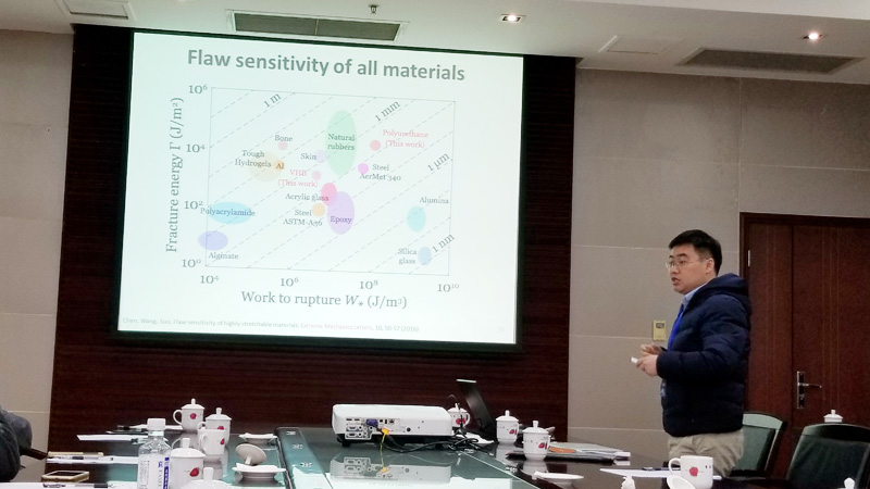 正在哈佛大学从事博士后研究工作的王正锦博士报告题目是《Mechanics of soft materials and application in oilfields, 他介绍了软材料断裂中的两个基本问题:材料的缺陷敏感性和高韧性水凝胶中裂纹扩展阻力曲线的尺寸效应,并通过理论推导和实验测试给出了两个对应的特征长度。王正锦博士还详细介绍了凝胶在油气井密封中的应用。他通过低压、透明的桌面尺寸实验装置模拟了石油封隔器的不同失效模式,并通过理论推导给出了封隔器的临界泄漏压力的解析解,对于封隔器的设计和改良提供了重要的指导准则。
