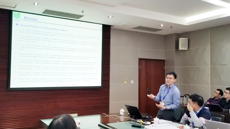 在第二场题为《Study on aerodynamic forces and flow field of wind turbine with wind tunnel and field experiments》的报告中,日本国立三重大学研究员李庆安博士主要利用风洞试验和外场测试技术考察了直线翼垂直轴风力机的空气动力学和流场特性。他在风洞中采用大型六分量天平探讨了风机在运转过程中在xyz三个方向上整机的力学特征;利用压力分布技术测量单个叶片在工作中的压力分布状况,在外场中对比分析了风洞试验和外场测试中风机力学和尾流特征,并着重考察了叶片数量、安装角度、翼展高度等风机基本参数对风机性能的影响。其研究成果实现了垂直轴风力发电机的简易设计标准。