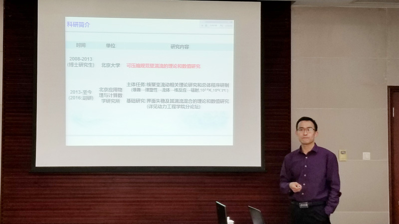 北京应用物理与计算数学研究所的张又升博士介绍了《可压缩规范壁湍流的理论和数值模拟研究》。张博士在利用超级计算机对可压缩规范壁湍流问题展开大规模直接数值模拟基础上,推出了可压缩壁湍流的速度场温度场普适关系,解耦了可压缩壁湍流速度场和温度场的耦合,进而探清了其马赫数、壁面温度、雷诺数三个维度的效应。在上述工作的基础上,完成了可压缩平板湍流边界层统计平均剖面的预测。其工作对于航空航天飞行器设计具有基础指导意义。