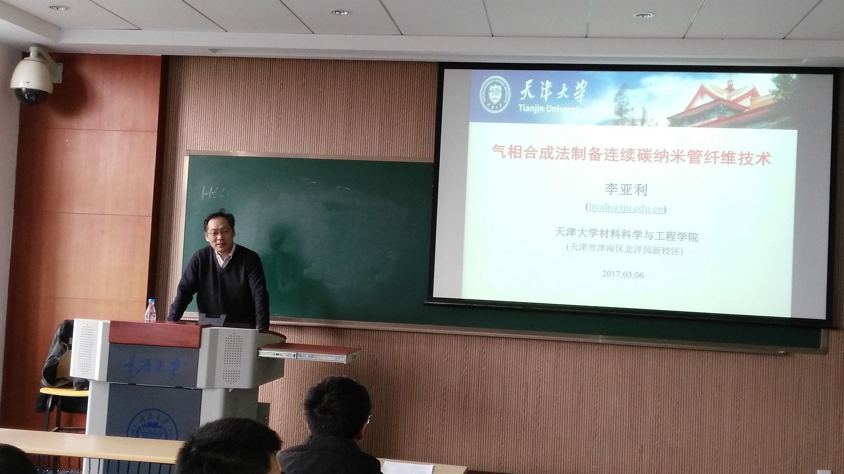 本次报告主题是“新型高性能多功能连续碳纳米管纤维及其复合材料”,在报告上,李亚利教授首先为大家介绍了碳纳米管及其纤维的发展历程,着重介绍了尤其本人发明的气相法制备连续碳纳米管纤维的方法,然后深入讲解了多年来他在推广碳纳米纤维及其复合材料方面的努力与成果。该报告充分展示了李教授十多年如一日的坚持且干好一件事的平实心态,展示了值得青年学者以及研究生学习的科研心态。最后,李教授还回答了现场青年教师及学生的问题,气氛热烈。