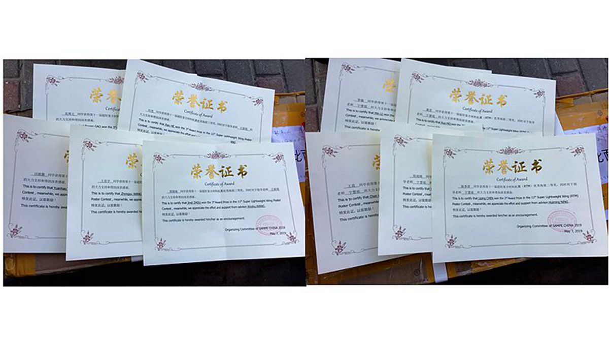 继去年首次参赛后,再次派出了6支队伍分别参加了预浸料机翼、液体成型机翼及碳纤维桥梁竞赛,并首次获得液体机翼优秀海报二等奖和预浸料机翼优秀海报三等奖各一项。