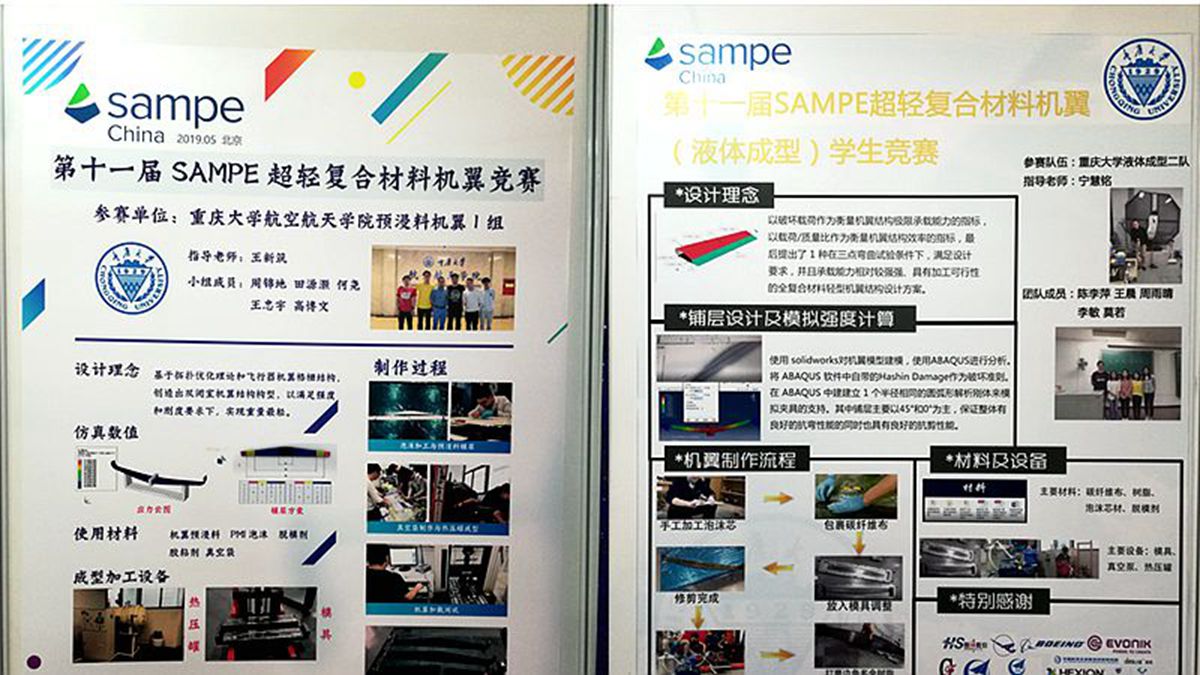 SAMPE(The Society for the Advancement of Material and Process Engineering)是一家以航空航天复合材料研发起家、以先进复合材料为主要关注点的国际性专业学会组织。由中国航空学会、SAMPE中国大陆总会共同主办,美国波音公司赞助支持的第十一届SAMPE超轻复合材料桥梁/机翼学生竞赛于5月6 -8日在北京中国国际展览中心举行。大赛分为机翼预浸料成型、机翼液体成型、碳纤维桥梁和天然纤维桥梁四大类,旨在普及先进复合材料结构设计及制造工艺知识,提升在校学生设计、优化、分析、建模及动手制作复合材料制件的能力,为高校复材相关专业的学生搭建一个施展才华的国际舞台,至今已举办十一届,在国内外业界具有极大的影响力。