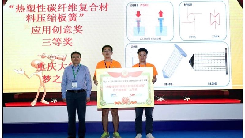 学生,在陈立明副教授的指导下,队员们经过两个多月的精心准备,分工协作、不惧重庆暑期高温天气、克服了比赛经验不足、设备资源缺乏等种种困难,利用暑期开展了压缩板簧详细的设计、计算分析与制备工作。大家首先进行了压缩板簧的设计与理论分析,并采用有限元方法分析结果,验证设计结构的可行性,随后通过优化设计与有限元分析相结合的方法,不断优化压缩板簧结构尺寸,追求更加完美的承力压缩板簧,并根据优化后的压缩板簧尺寸进行模具设计加工。最后,采用热压磨具法制备完成热塑性复合材料压缩板簧试件。比赛中,大家还在陈立明老师的指导下完成了热塑性复合材料在骨钉连接件等医疗领域应用的创新设计方案。